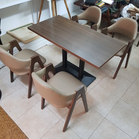 – Ghế: Gỗ cao su, đệm ngồi mút bọc giả da.